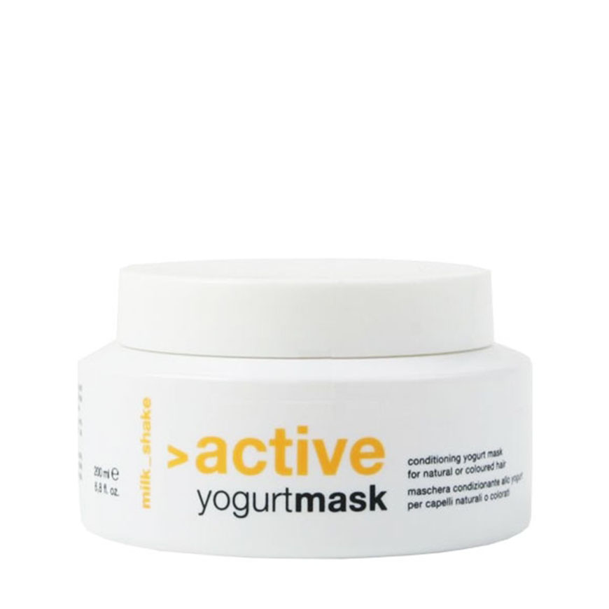 Conditioning yogurt mask for natural or colored hair milk_shake active yogurt mask is a rich conditioning mask created to nourish and condition natural, color-treated and slightly dry hair. Yogurt amino acids bind with hair structure, leaving hair strong and full of body. Integrity 41 extends color life, while avocado and rice oils, honey and fruit extracts, special moisturizing agents and vitamin E condition the hair shaft. Hair is left soft and shiny.