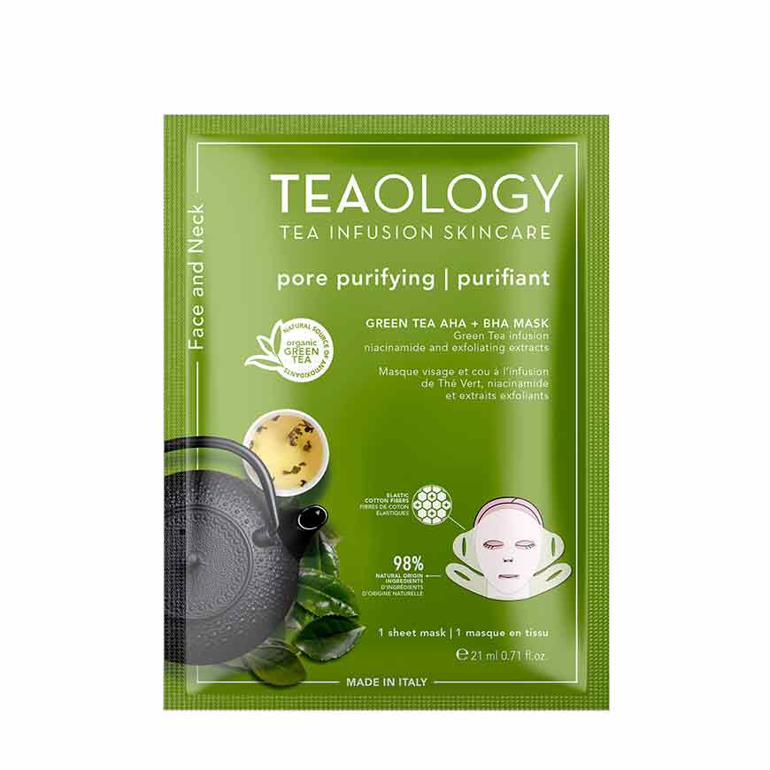 Anti-ageing smoothing face and neck mask in soft stretch cotton fibres with Green Tea infusion, Niacinamide and exfoliating AHAs. Transforms the skin in just 10 minutes. Its formula is a concentrate of Teaology’s patented antioxidant and pollution-tested Organic Green Tea infusion, an exfoliating complex of alpha hydroxy acids that regenerates and illuminates the skin, and a natural source of Salicylic Acid (BHA) that gently removes impurities and unclogs pores. Medium and high molecular weight Hyaluronic Acid provides deep hydration and a lifting effect in the different layers of the epidermis, while the synergistic action of anti-inflammatory Niacinamide and a Green Tea extract rich in Epigallocatechine (EGCG) protects the skin from impurities and from pollution damage.