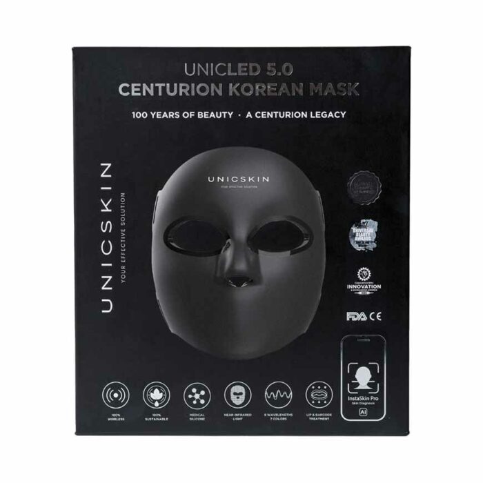 The UNICLED 5.0 CENTURION KOREAN MASK is a revolutionary facial mask that combines LED and Near Infrared Light (NIR) Technology to transform your skin in just 20 minutes, WITHOUT PAIN OR NEEDLES. With 528 optimised LED lights emitting 8 wavelengths and 7 LED colors, it treats the full face comprehensively: forehead, nose, cheekbones, lip area and nasolabial fold. Its wireless, ultra-light and ergonomic design, made of medical grade silicone, 100% antibacterial, ensures a perfect fit without leaving marks and allows you to share it safely with your family, friends and even your office colleagues. It also incorporates a silicone eye protection system for a safe, relaxing and non-marking experience. The ultimate tool for advanced and effective facial care with professional SPA results from the first use.
